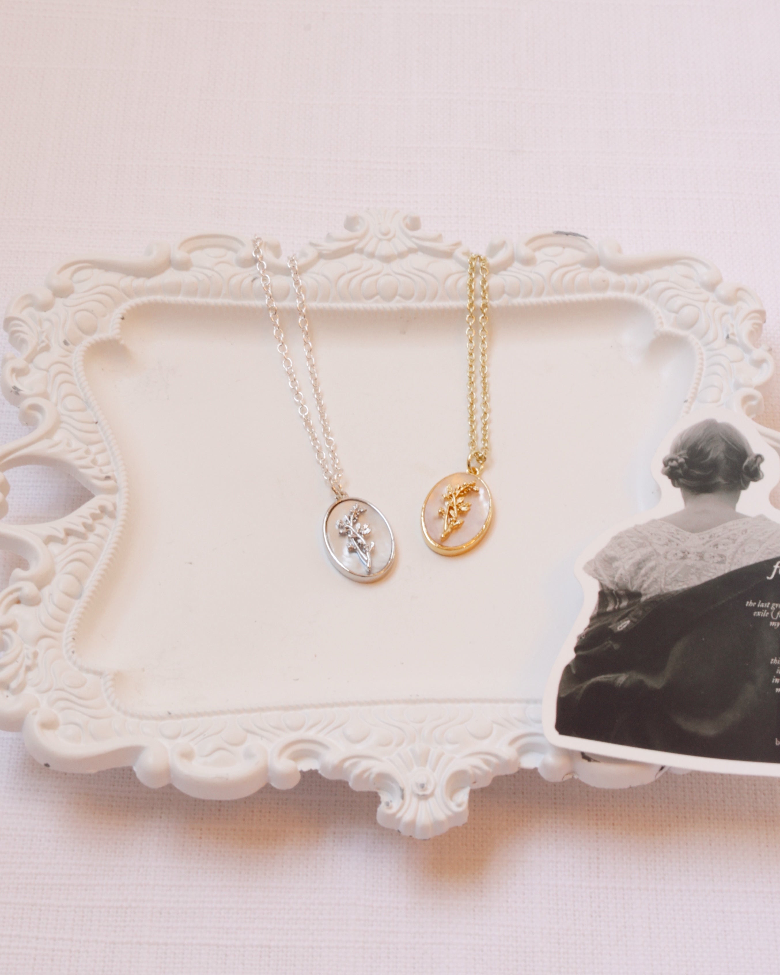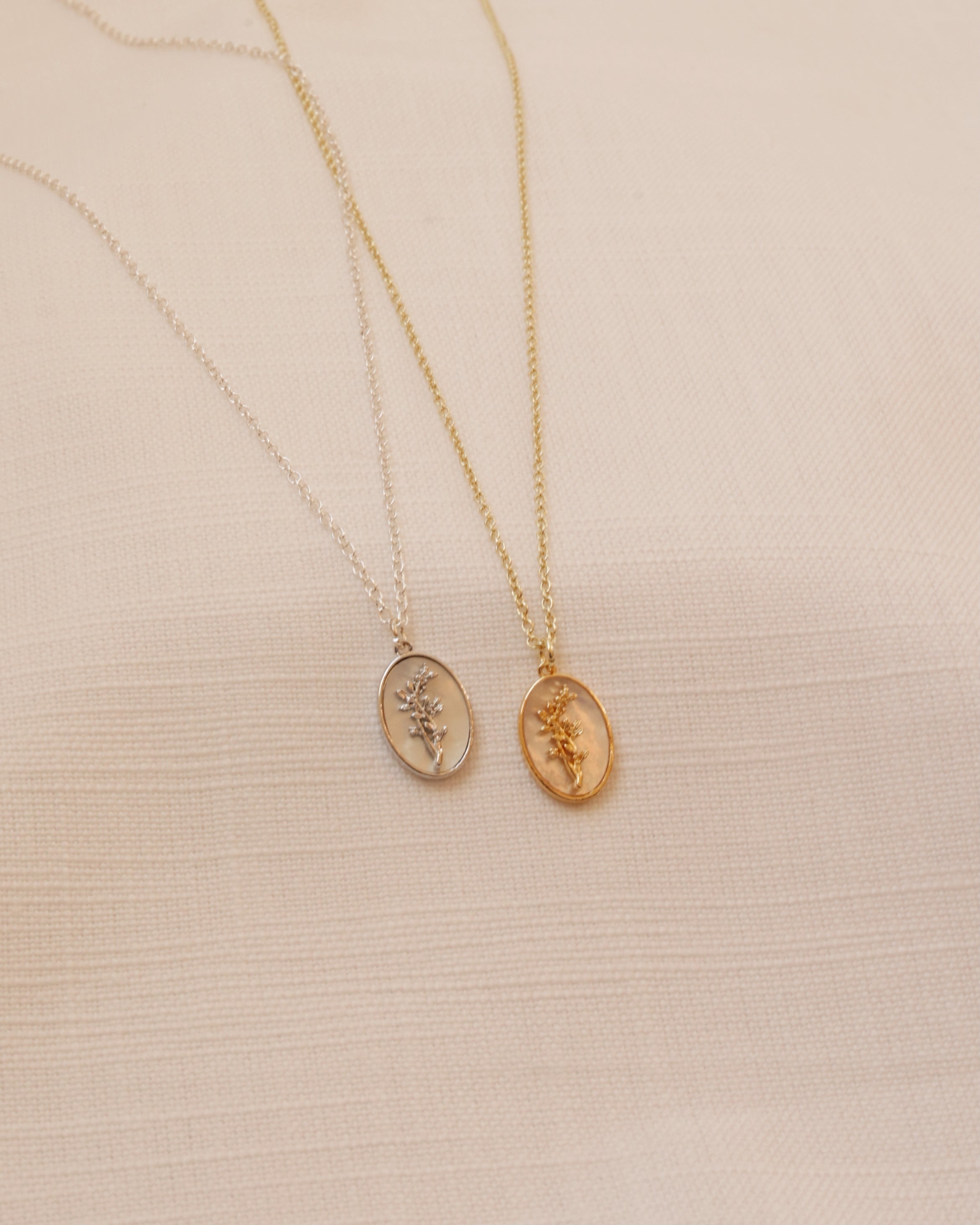 - Features a mother of pearl charm with a delicate "weed"